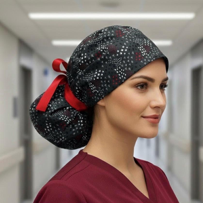 Surgical Scrub Cap with Ponytail Nurse Uniform Hat for Operating Room Charcoal Gray with Small Red and White Print