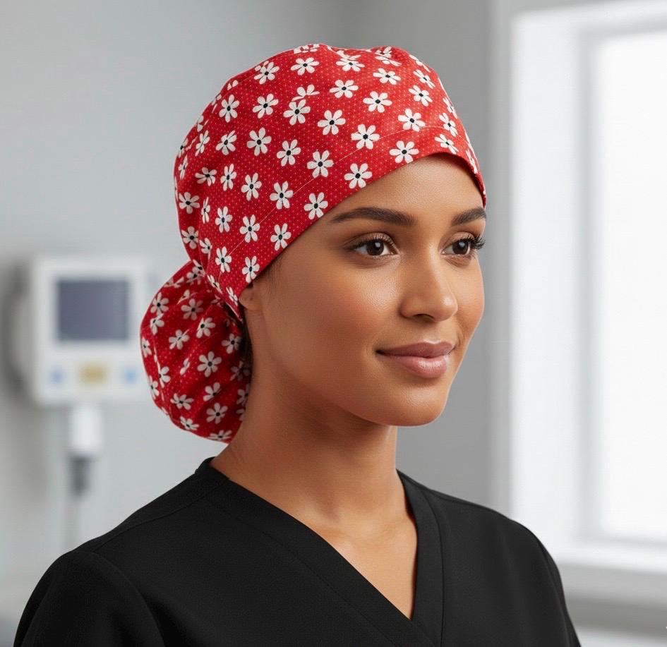 Surgical Scrub Cap with Ponytail Nurse Uniform Hat for Operating Room Red with White Flowers
