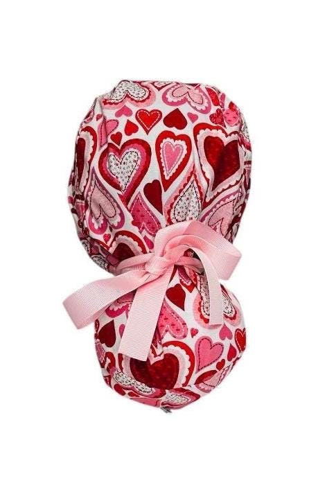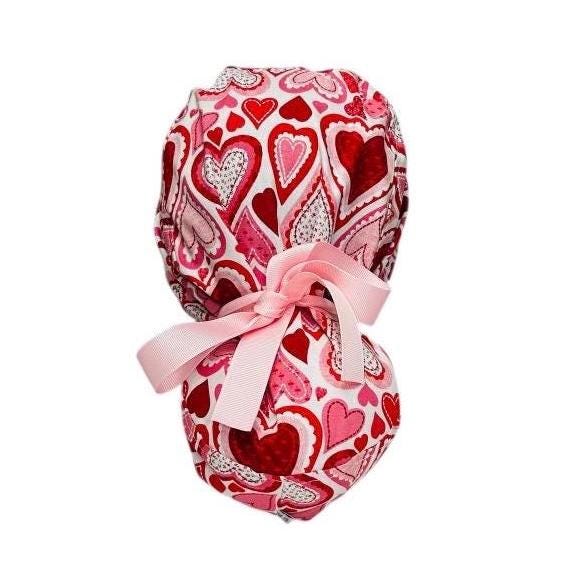 Valentines Day Pink and Red Hearts ❤️💖Print Surgical Scrub Cap with Ponytail Nurse Uniform Hat for Operating Room