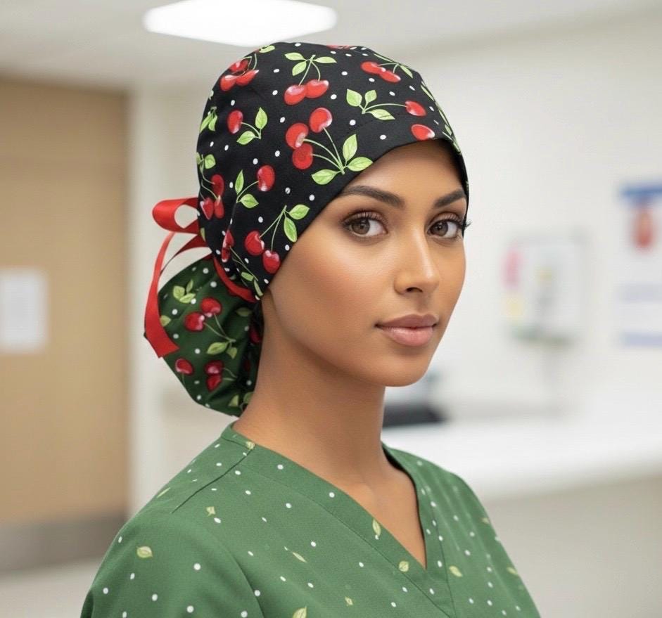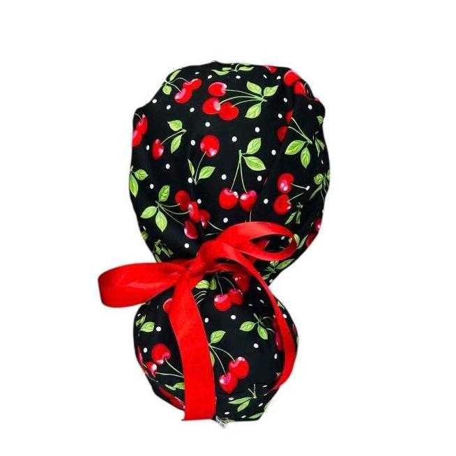 Surgical Scrub Cap with Ponytail Nurse Uniform Hat for Operating Room - Black with Red Cherries 🍒 Print