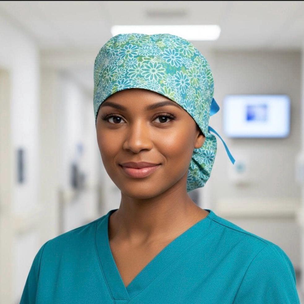 Surgical Scrub Cap with Ponytail Blue and Green Floral Print Nurse Uniform Hat for Operating Room